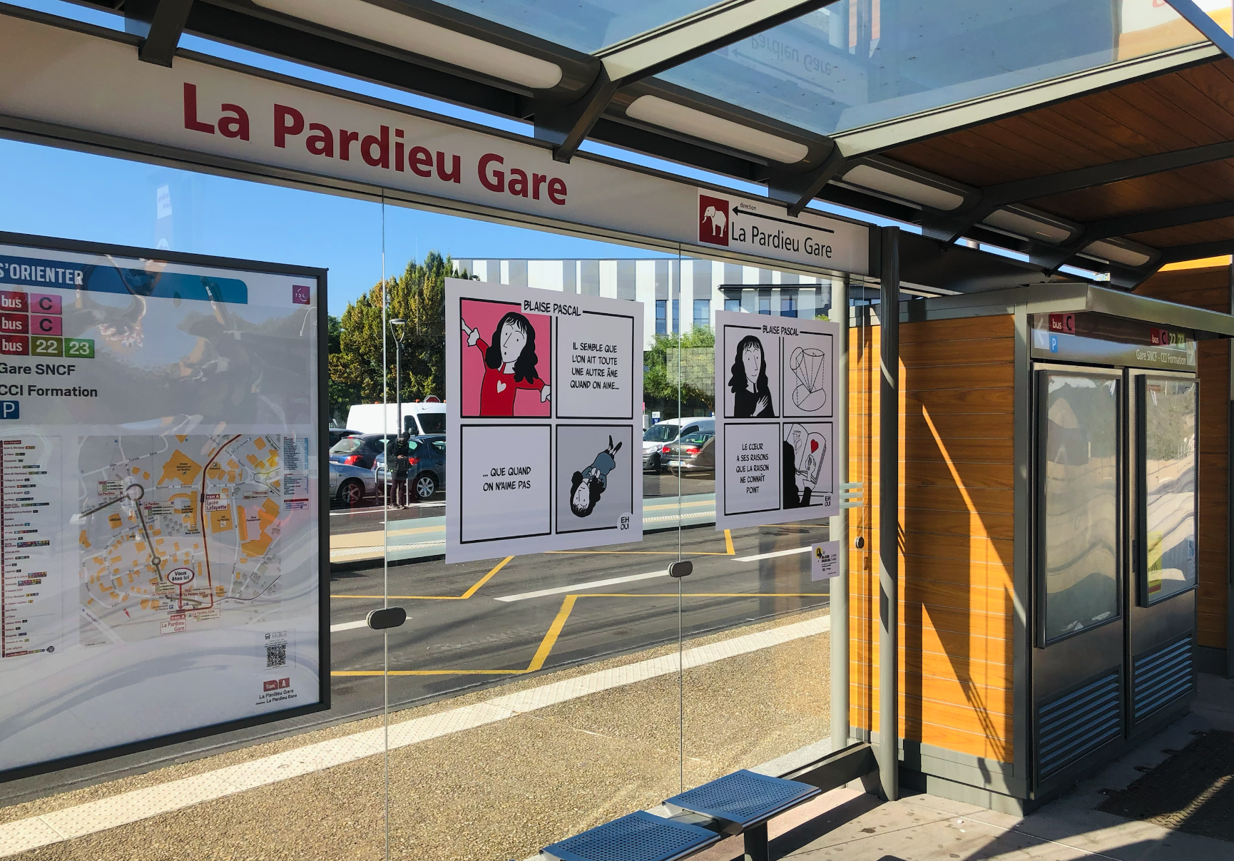 Exposition des illustrations de EHOUI sur les abris de tramway de Clermont-Ferrand /